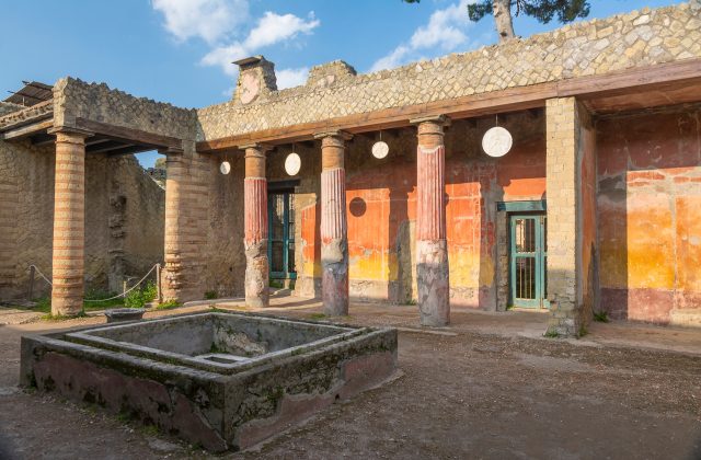 The archeological site of Herculaneum presents street paving stones, the Inlaid marble floor, the frescoes and various villas like the most famous Villa dei Papyri. Hercualneum and Pompeii are an important part of the history of this land.